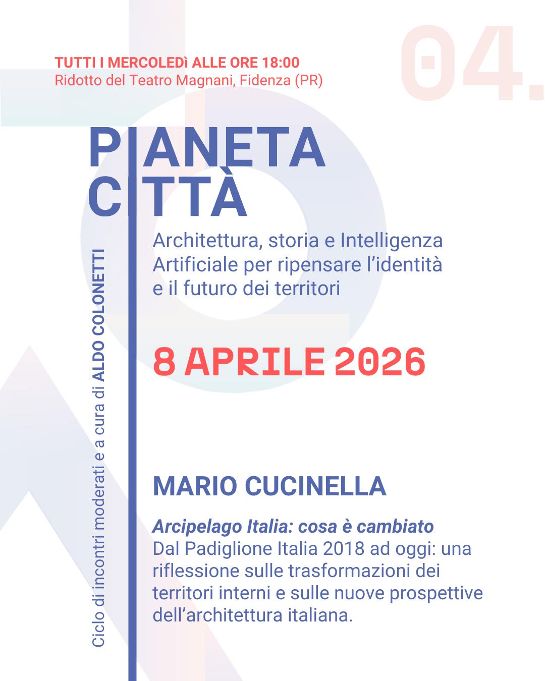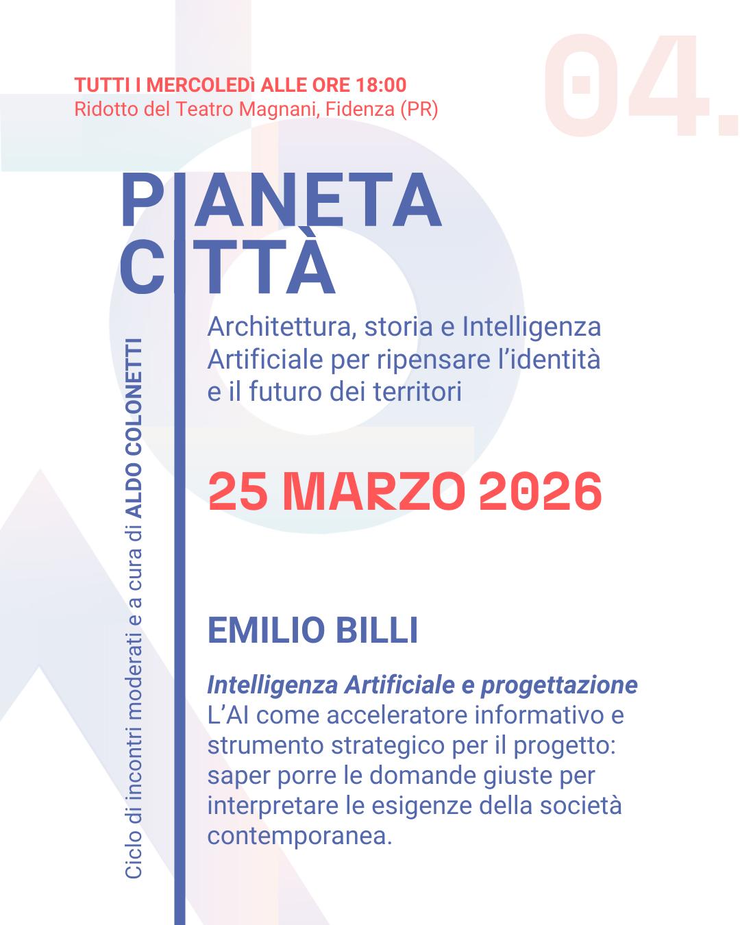 Gli ospiti di Pianeta Città 2026 sono l’architetto Mario Cucinella, lo storico Fulvio Irace; Giancarlo Consonni, architetto responsabile dell’Archivio Piero Bottoni; il demografo Matteo Manfredini ed Emilio Billi, uno dei maggiori protagonisti a livello internazionale dell’AI, residente in California.